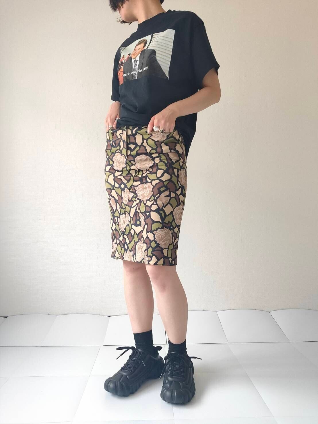 ミリタリーな雰囲気の中にローズが紛れ込んだスカート。